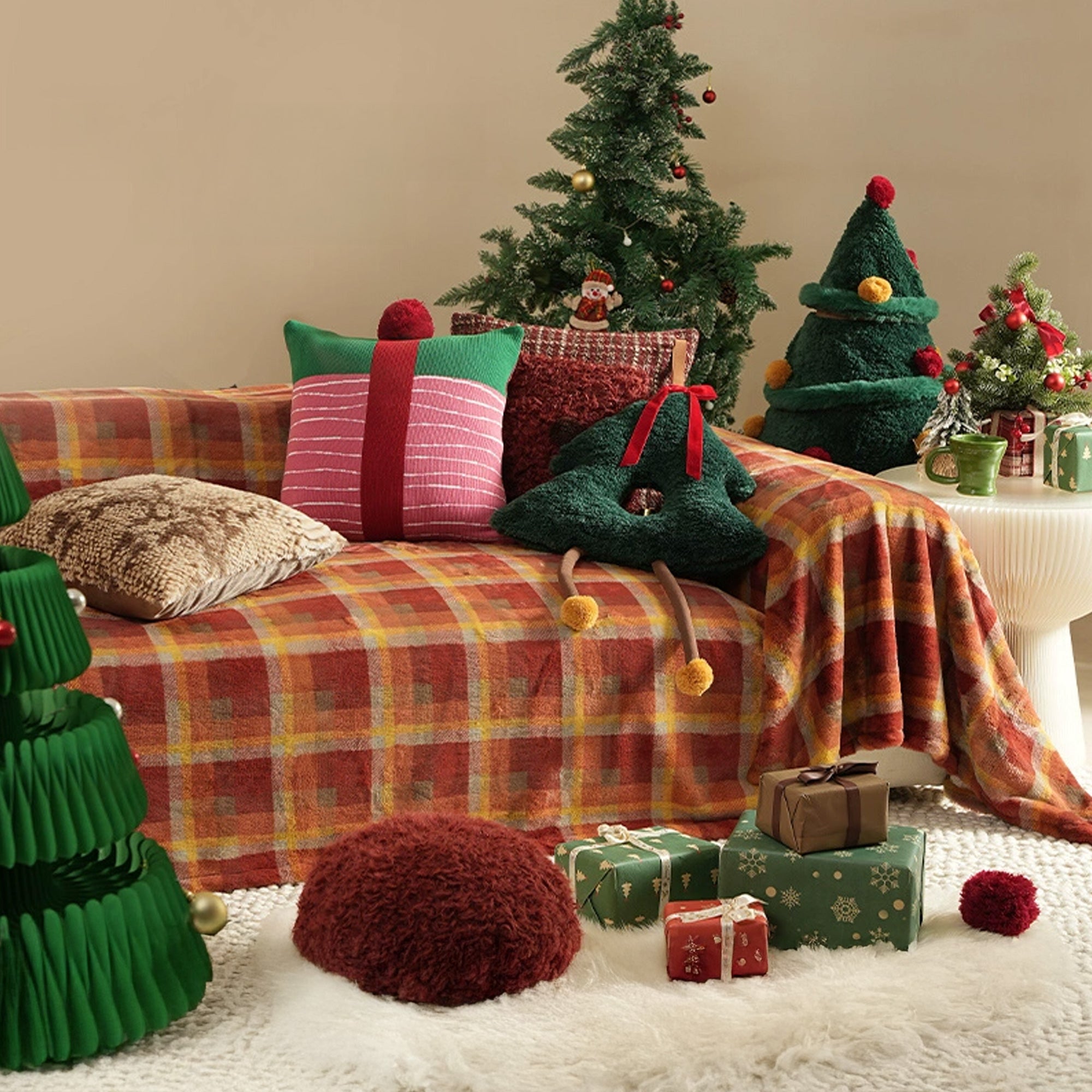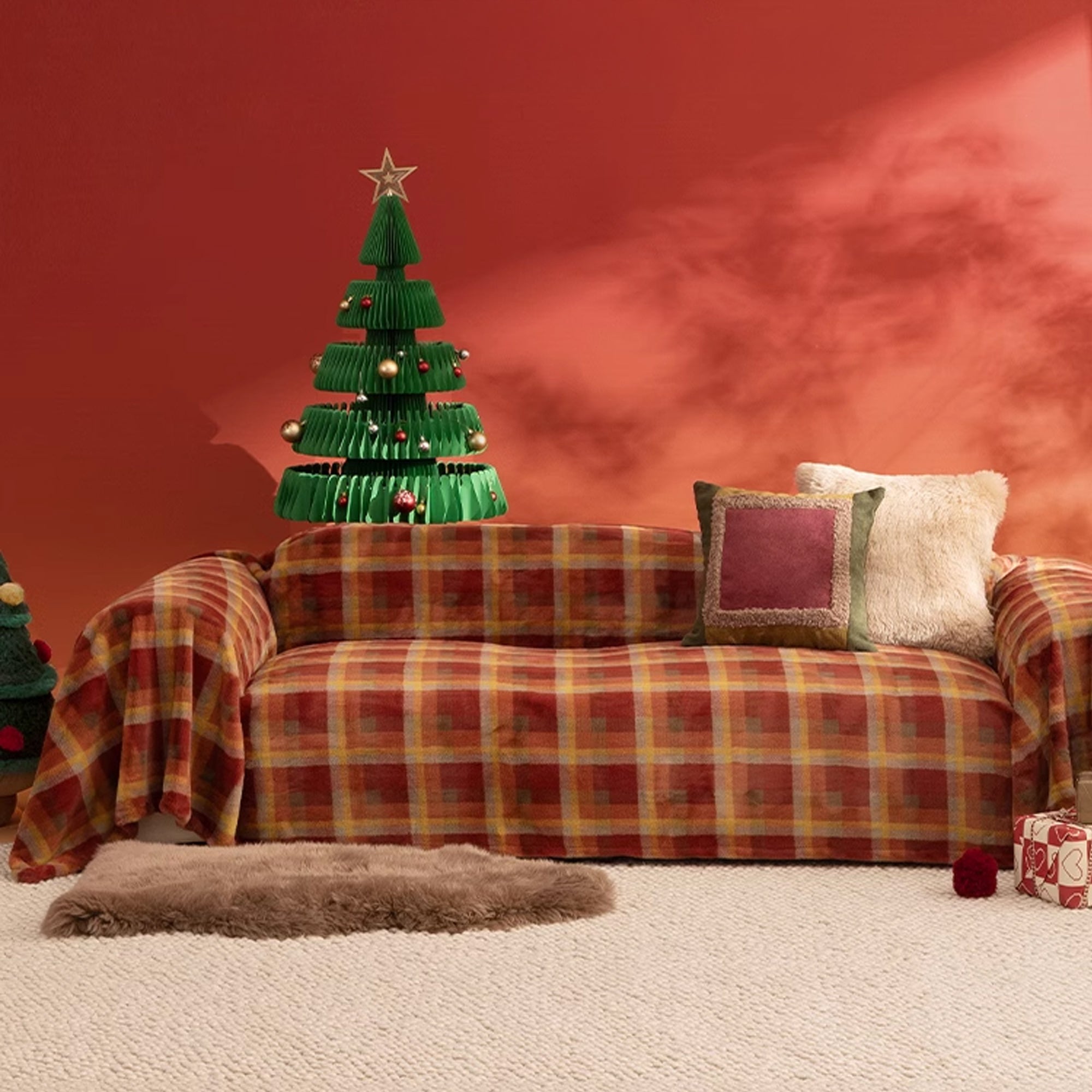 •Design: The classic plaid pattern features bold red tones combined with neutral accents, giving it a festive yet timeless look. The design is both cheerful and cozy, making it the perfect choice for the holiday season.The traditional plaid design invokes a nostalgic, rustic Christmas feeling, while the rich red color brings warmth and vibrancy to the space.